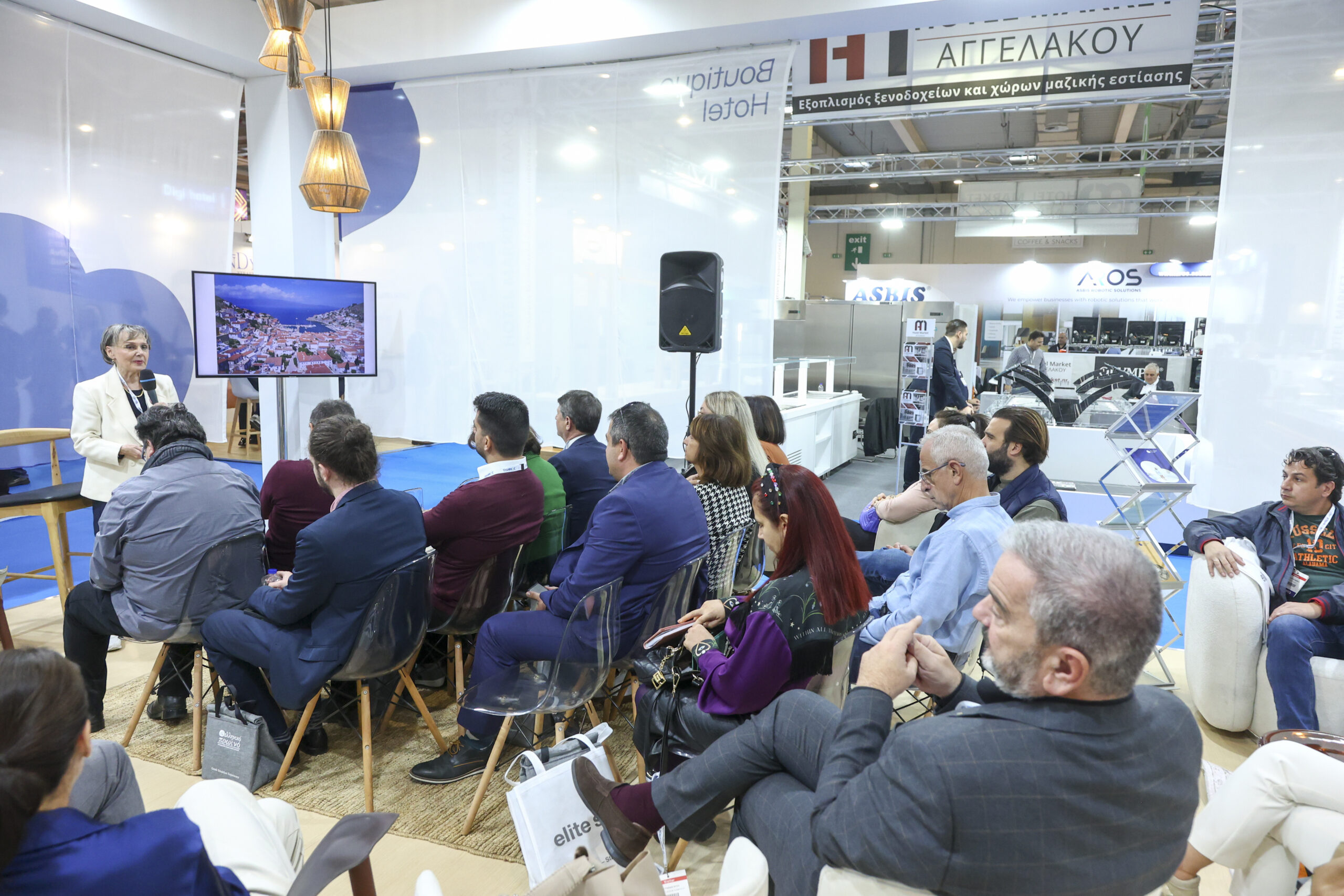 In addition, tourism and hospitality students from Public Vocational Training Institutes of Piraeus, Acharna and Agios Dimitrios visited the stand. Afterwards, Mrs. Christina Tetradis, vice-president of Hellenic Chamber of Hotels, addressed a greeting, Mrs. Emilia Vlami defined the framework of the Boutique Hotel program, Mrs. Maria Tzannou presented its new identity and Mrs. Katerina Saridaki highlighted the possibilities of developing new innovative technological companies active in the hotel sector industry.